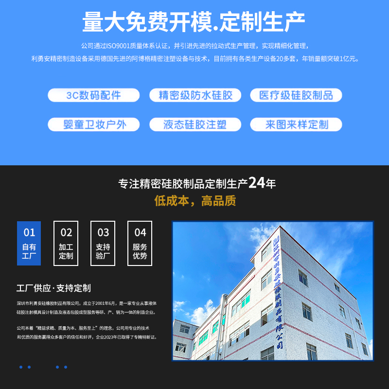 利勇安硅膠始終堅持誠信務實的工作態度,專注技術創新與品質提升致力于打造高質量硅膠產品,持續深耕汽車、智能穿戴、母嬰用品、3C電子、醫療行業與電子霧化等多個領域。專注液態硅膠制品精密技術研發24年。